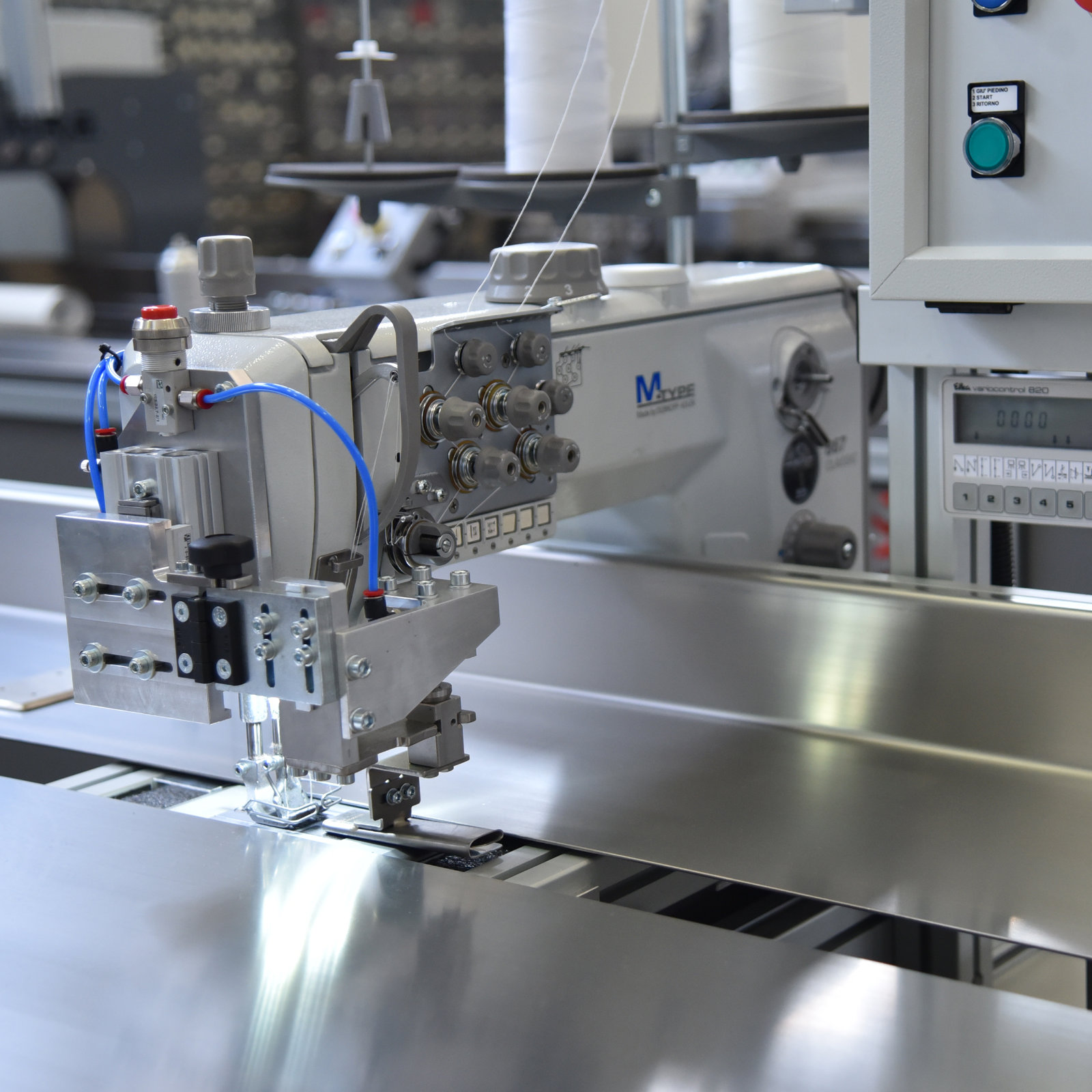 O controle avançado por CLP permite a sincronização digital automática do movimento da agulha e da cabeça de costura, garantindo precisão em cada operação.